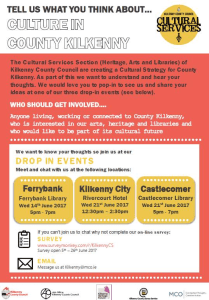 The Culture Services Section of Kilkenny County Council are creating a Cultural Strategy for the County and they would like to hear your thoughts and opinions. There will be three drop in events in County Kilkenny in June which will give you the opportunity to express your opinions (see poster below) or you can email kilkenny@mco.ie or complete the online survey www.surveymonkey.com/r/kilkennyCS which is open from 5th – 26th June
